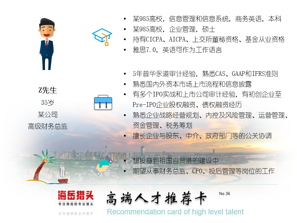 根据《海南自由贸易港建设总体方案》,海南将支持金融机构立足海南旅游业、现代服务业、高新技术产业等发展需要,创新并提供高质量的金融产品。当然,海南并非要取代香港成为国际金融中心,反而会与香港形成很好的优势互补。更多的则是根据实际发展状况,重点服务并推动海南区域相关经济主体的发展。在最新发布的《海南自贸港高层次人才分类标准2020》中,对人才评价体系进行了更加科学、规范的划分。对于现代金融服务业,其中的ACCA、AICPA、CFA等持证者被纳入了D类人才,CPA、会计审计等高级职称者则划入了E类人才。这些变化表明人才的评价标准越来越具体化,破除了唯“帽子”倾向,不把“帽子”作为评价人才的唯一标准,更加符合经济社会的可持续发展。越来越多的优秀人士向往海南的发展沃土,有志投身于中国特色自由贸易港的建设中。